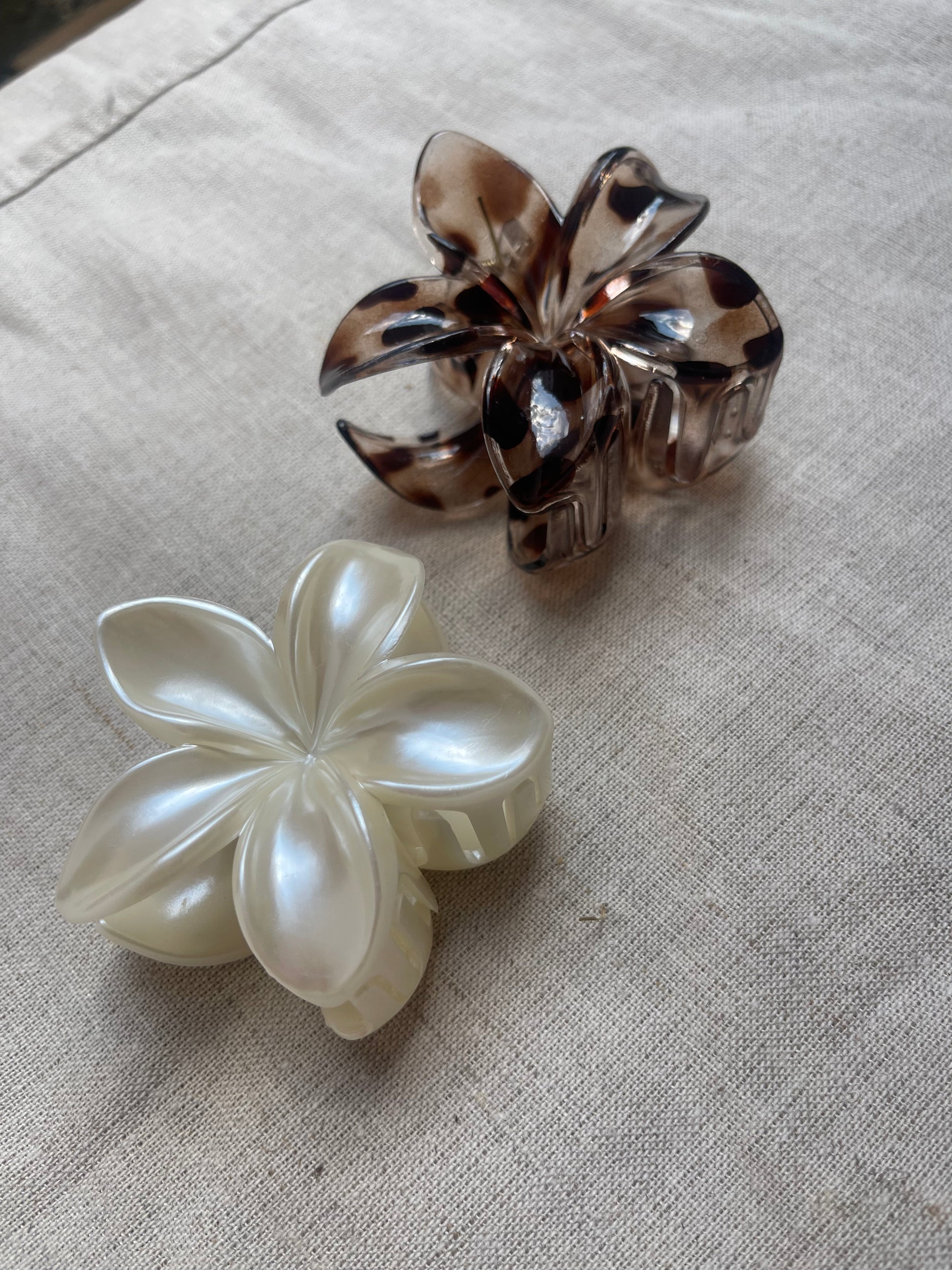 Die Haarklammer hat die Form einer Blume und ist mit einer matten Oberfläche versehen.