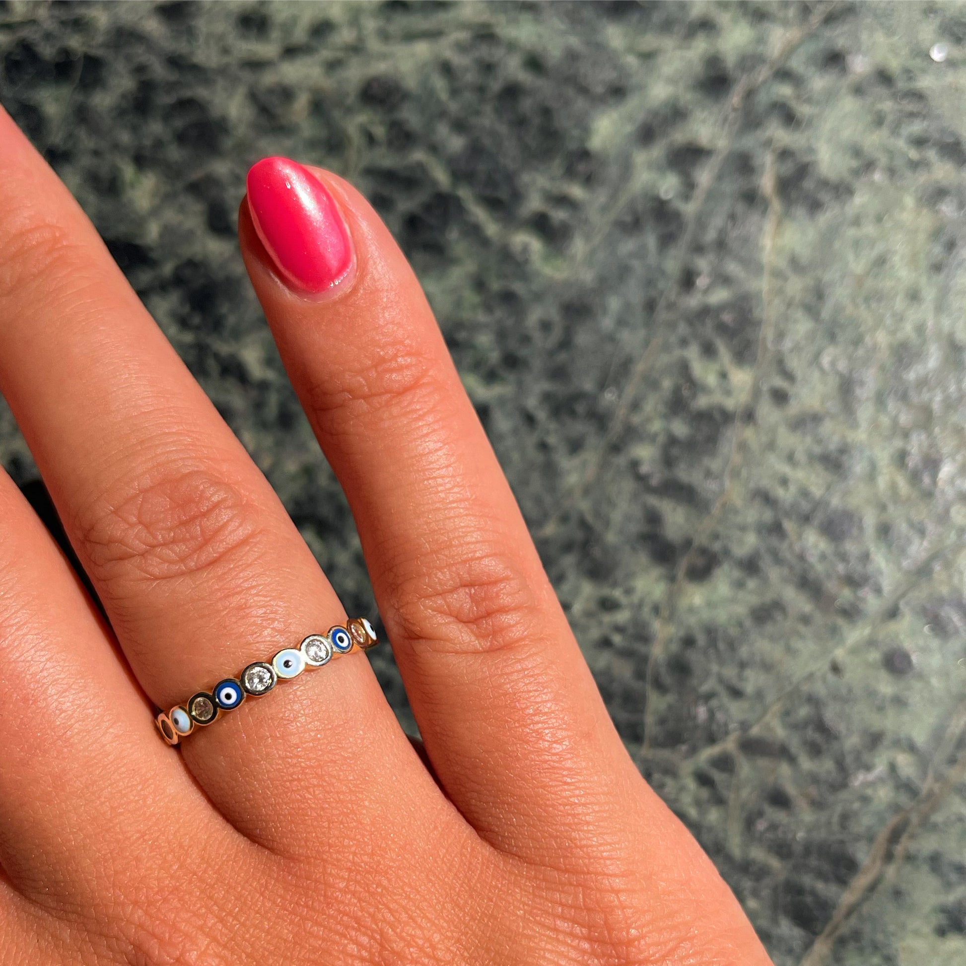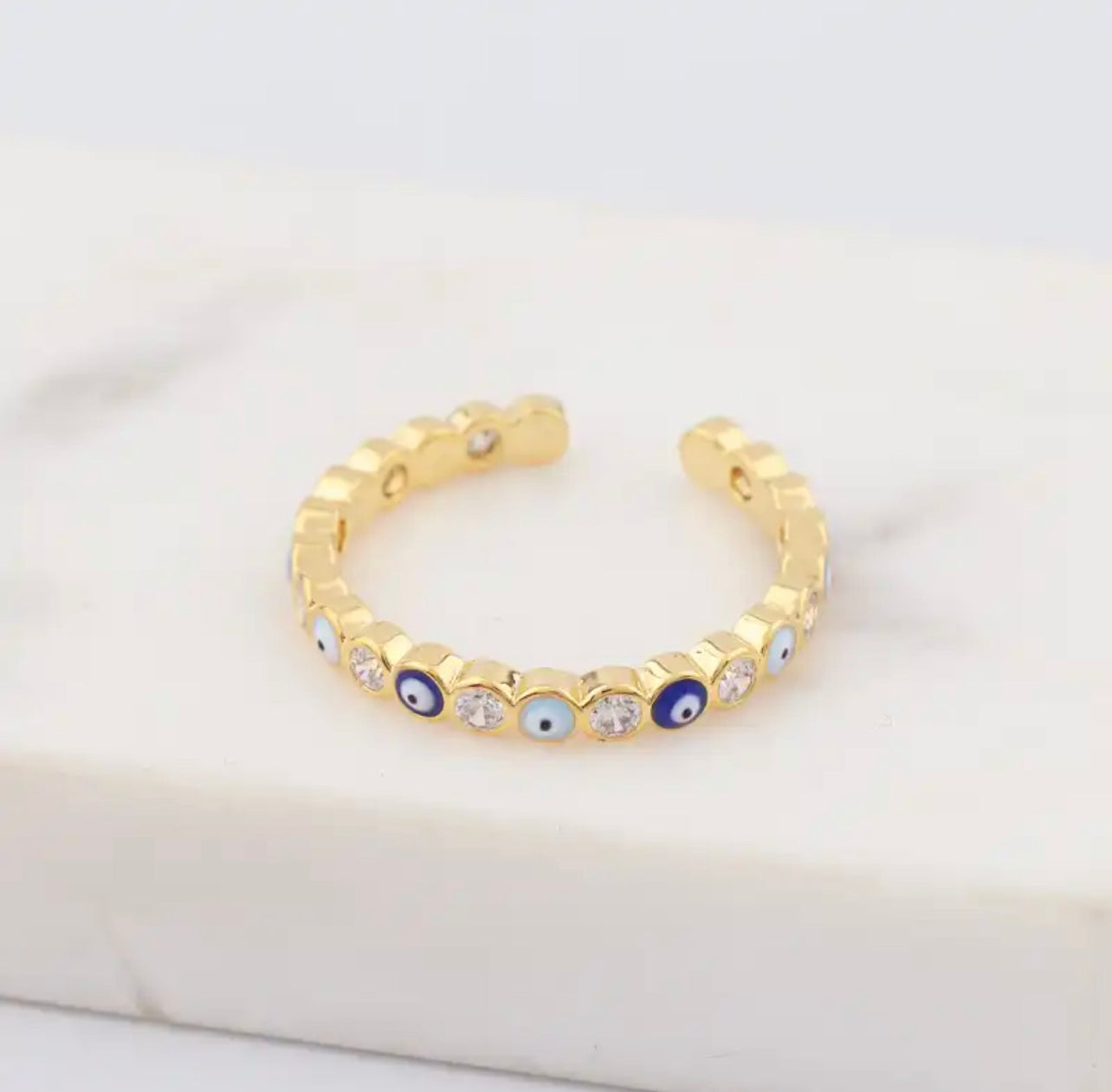 Goldfarbender Ring mit blauen Augen und Zirkonia Steinen besetzt.