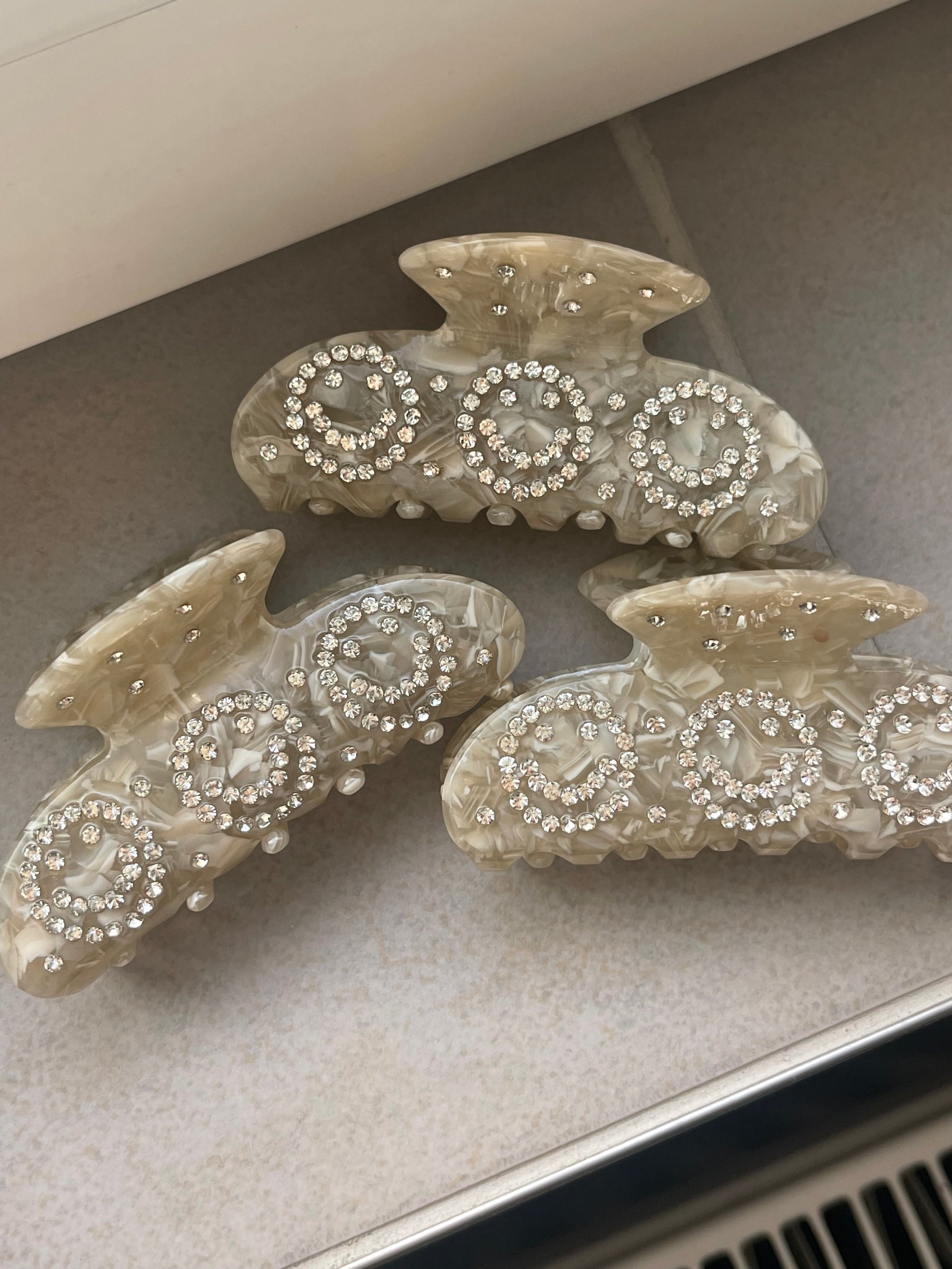 Die Haarklammer ist mit Strasssteinen die Smileys bilden versehen.