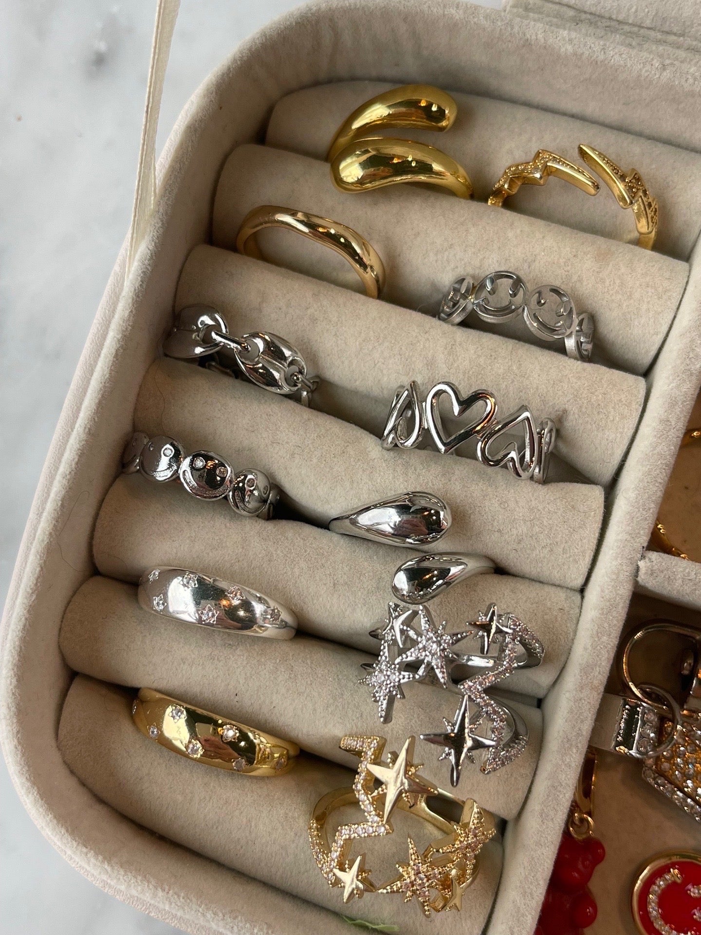 Gold oder Silber farbender Ring in Form von vielen Sternen und mit Zirkonia Steinen besetzt.