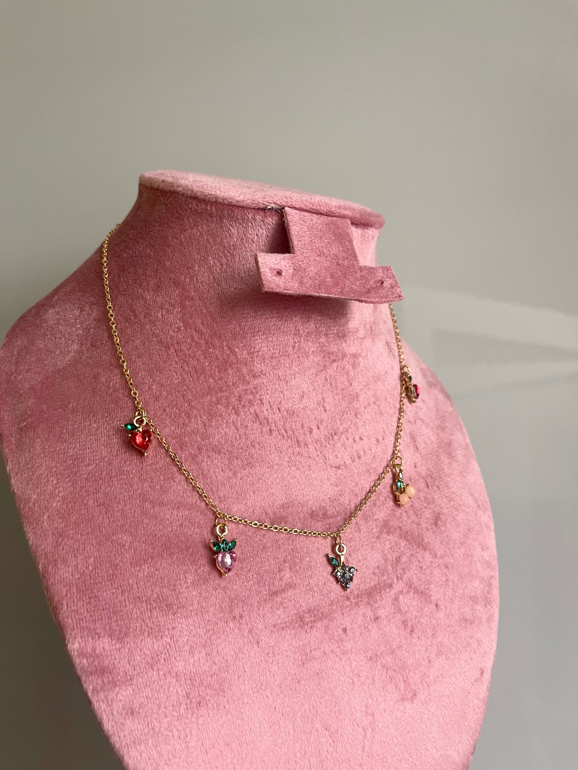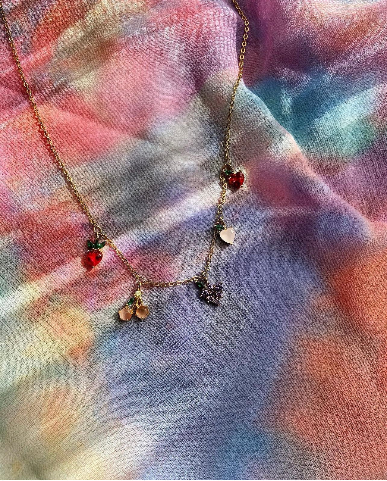 Die mit fünf unterschiedlichen Früchte Schmucksteinen verzierte Kette wirkt zugleich zierlich und elegant.